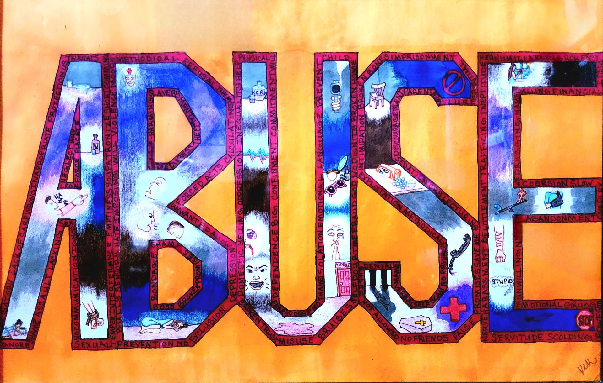 Abuse comes in many forms, not just physical. In this piece, I have tried to convey, not only the many types, but also the feelings a victim experiences during these types of abuse. The word itself is outlined in words of abuse and associated terms and feelings. The body of each letter is filled with images depicting a few of these.